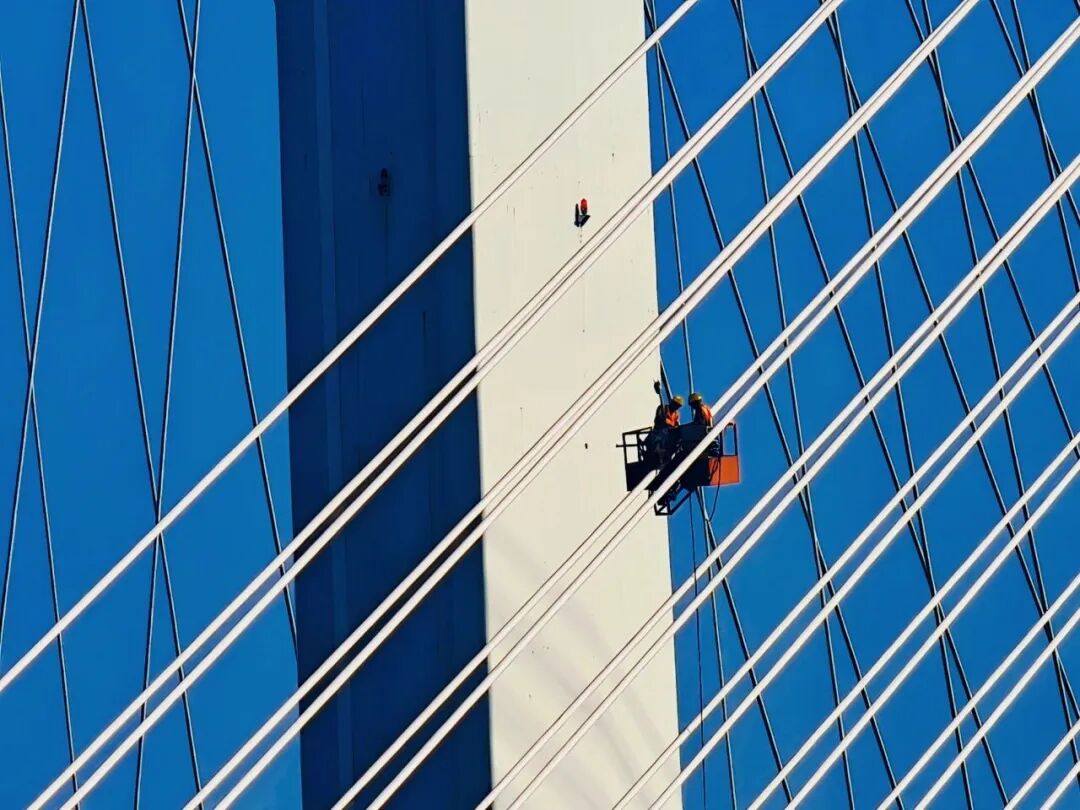 据介绍,路段连接广州、佛山、中山、江门四市,四座斜拉桥横跨西江与洪奇沥水道,是承担跨江交通流、缓解区域路网压力的核心枢纽桥梁群,此次养护工程首次规模化应用无人机智能巡检与自动爬索载人机器人等数字化技术,推动桥梁管养从“人防”向“技防”转型升级。