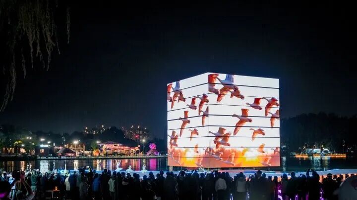 直径13.5米的立方体和水上浮动环形平台组成了光影“魔方”,光影变幻不定,“魔方”的形状也随之重组——美轮美奂的画面不断切换,不时有跃动出画面的“飞鸟”和“大鱼”,环形舞台出现了芭蕾舞《天鹅湖》的优美倩影……游船上和岸边的市民游客不由发出赞叹,忙着拍照分享。这是亮马河上的“盲盒现场”常态,“魔方”的每一次变化都会带来惊喜,夜晚的亮马河两岸愈发迷人。