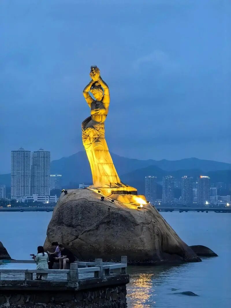 渔女雕像站在那儿举着一颗“珠”,老传说说这片海古时盛产珍珠,城名也从这来,雕像出自潘鹤大师,算镇馆之宝。