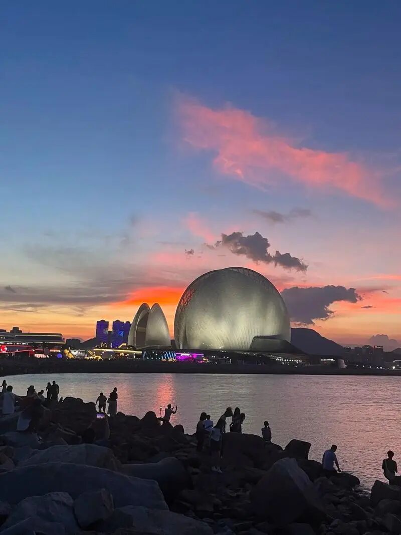 日月贝歌剧院就像两枚贝壳立在野狸岛边上,晚上灯一开,像把月亮捧在手里。