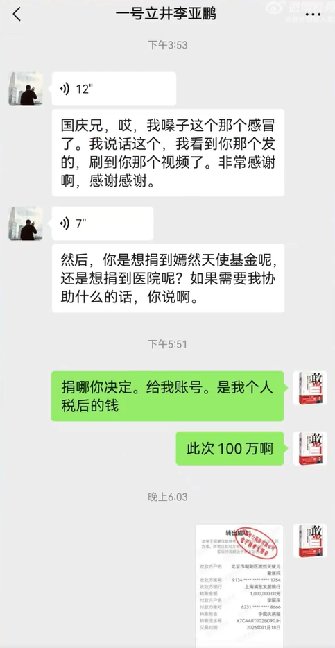 近日,北京嫣然天使儿童医院被曝因欠租面临关停,引发广泛关注。1月18日,当当创始人李国庆发视频称,他已向李亚鹏捐款100万元,并晒出银行转账截图。 1月17日,李国庆就表示,决定提前半年启动公益,资助100个唇腭裂儿童手术,包含支付手术及差旅费用,并夸赞李亚鹏“厚道有远见,但总早于市场三五年行动”。 此前,李国庆还发布视频声称自己愿意出资,与西贝贾国龙一起成立公司。