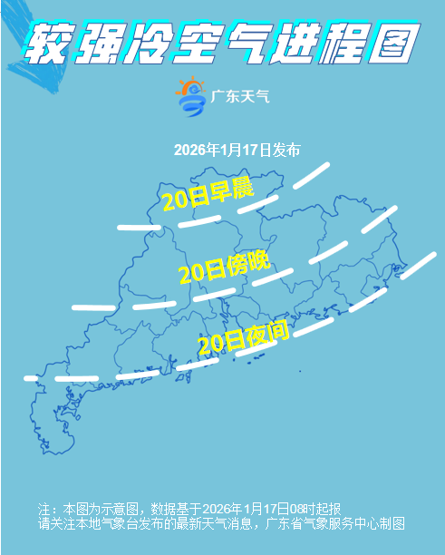 据广东省气象台消息,北方较强冷空气前锋20日早晨影响粤北,傍晚前后影响中部,20日夜间影响南部沿海,过程最低气温出现在22日前后,21日~23日粤北有大范围5℃以下低温,粤北高海拔山区-4℃~0℃,有雨夹雪或冻雨(冰冻)。