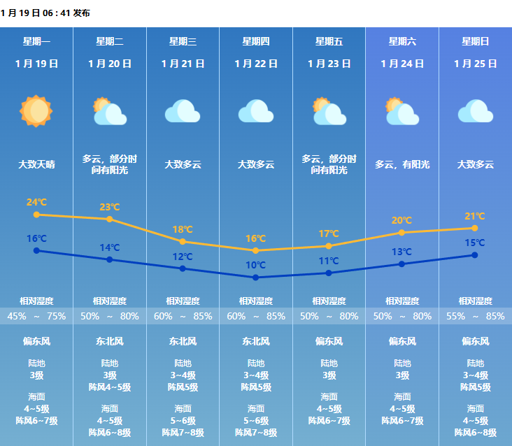 预计20日起一股冷空气将自北向南影响我市,气温开始“阶梯式”下降,海面阵风明显加大,可达6-7级。21-22日冷空气持续补充,日最低气温逐日下降,22日早晨最低可能降至10℃左右,早晚体感寒凉。