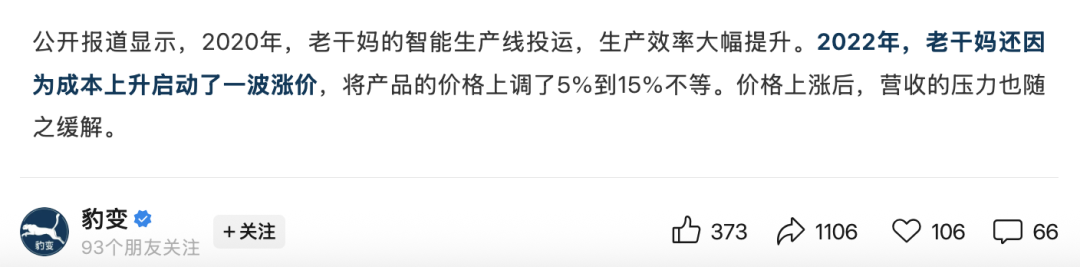 2022年,老干妈还因为成本上升启动了一波涨价,将产品的价格上调了5%到15%不等。价格上涨后,营收的压力也随之缓解。