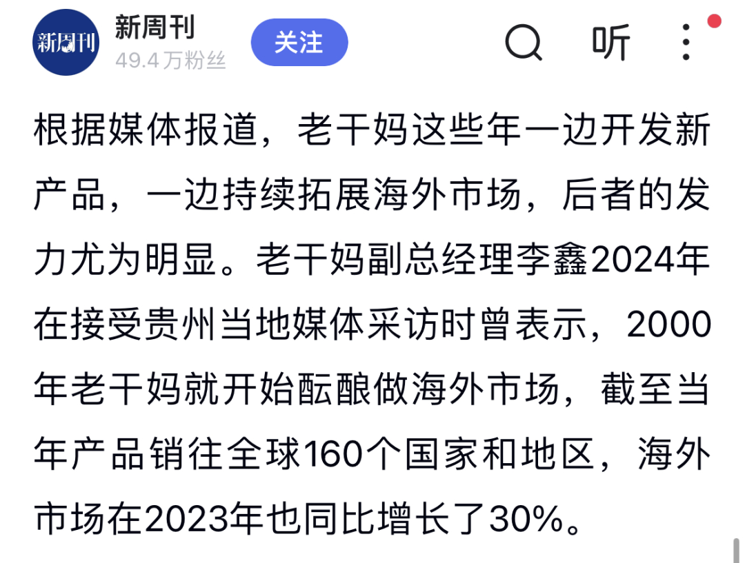 老干妈副总经理2024年在接受贵州当地媒体采访时曾表示,2000年老干妈就开始酝酿做海外市场,截至当年,产品销往全球160个国家和地区,海外市场在2023年也同比增长了30%。
