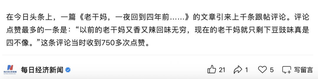 有用户吐槽,“以前的老干妈又香又辣回味无穷,现在的老干妈就只剩下豆豉味真是四不像。”