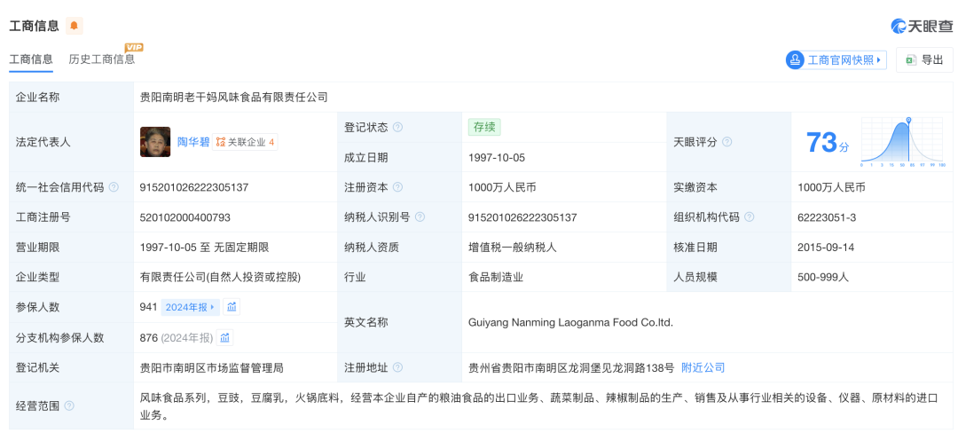 1997年,【贵阳南明老干妈风味食品有限责任公司】正式成立,陶华碧为法定代表人。