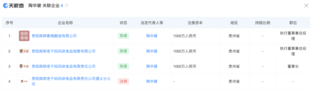 目前,陶华碧名下关联4家企业,3家为存续状态。
