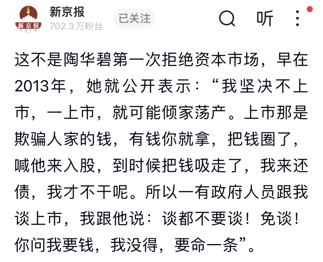 陶华碧曾被问及为什么不愿意上市,她回答道:“我坚决不上市,一上市,就可能倾家荡产。上市那是欺骗人家的钱,有钱你就拿,把钱圈了,喊他来入股,到时候把钱吸走了,我来还债,我才不干呢。”