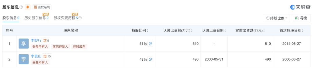 天眼查显示,李妙行、李贵山分别持有【贵阳南明老干妈风味食品有限责任公司】51%、49%的股份。
