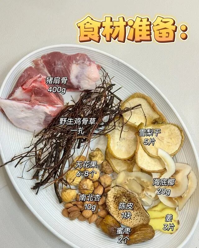 猪扇骨400克 , 鸡骨草一小扎 , 雪梨干5片 , 无花果8个。