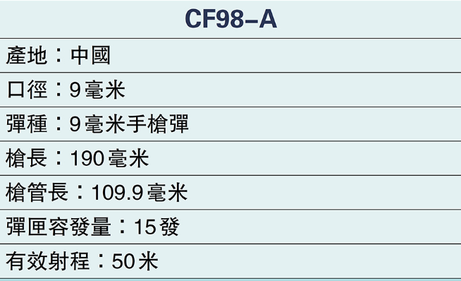CF98A式半自動手機使用9毫米口徑手槍彈,該槍有外露式擊錘、雙動扳機、塑料握把與套筒座,採用模塊式設計,符合人體工程學。