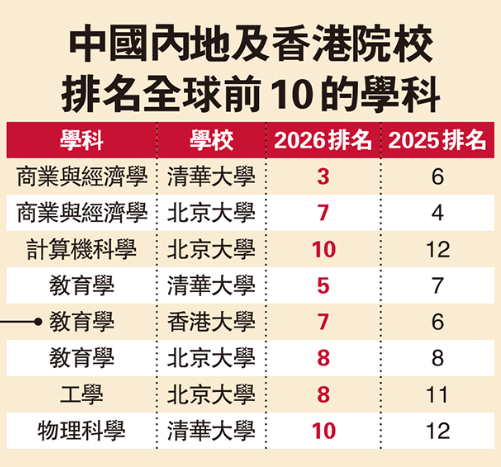 中國內地高校首次在計算機科學與物理科學兩個學科進入全球前十,十大學科總數由去年四個增至七個。