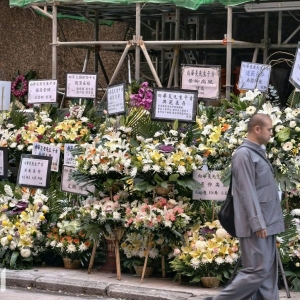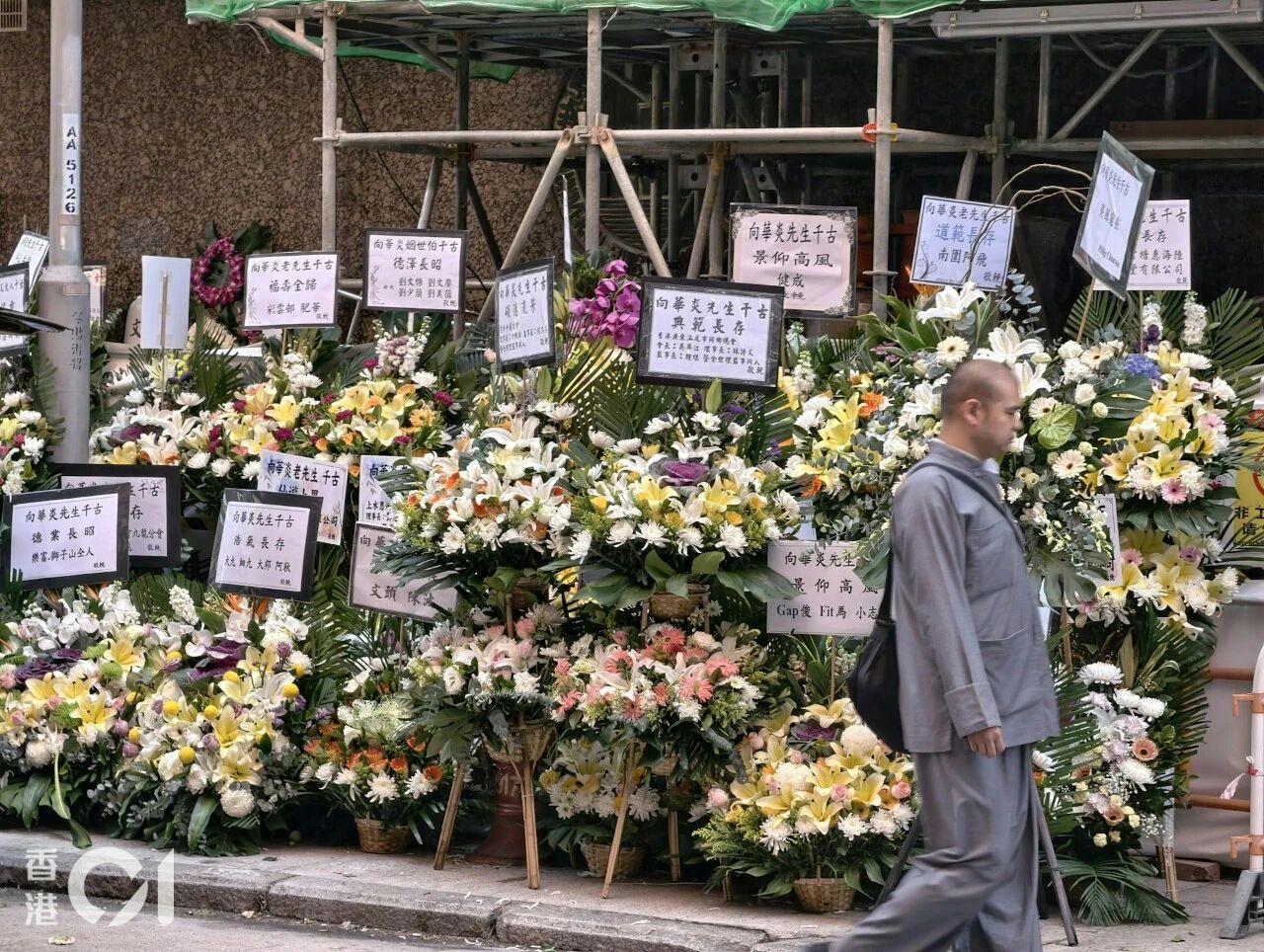 圈妹看到,灵堂外摆放了大量花圈,多名新义安成员身穿西装在现场打理丧事。
