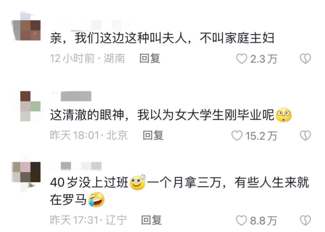 网友们普遍不敢相信真的有女人活成了偶像剧女主的样子,评论区里更全是柠檬精:“姐姐,我们管这种不叫家庭主妇,叫夫人。”