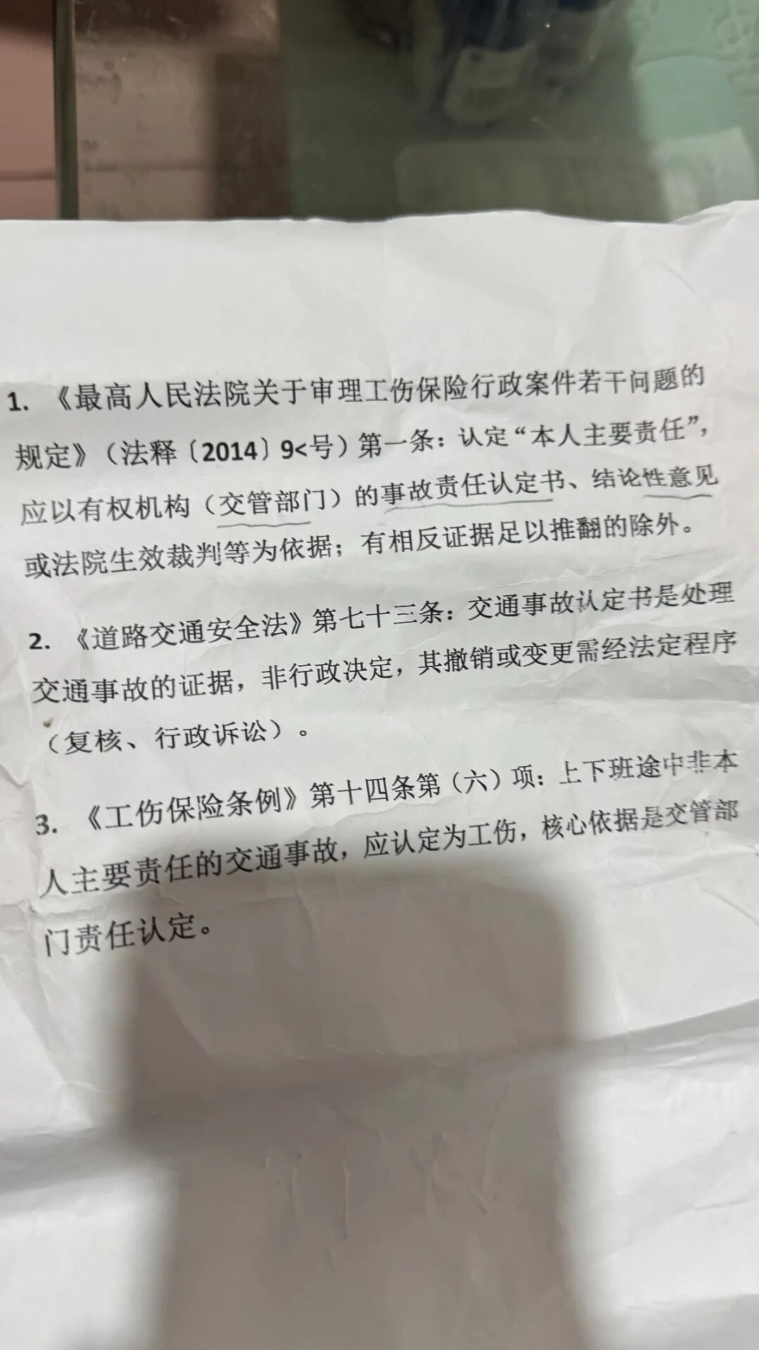 记者采访赵正时,他拿出一张此前从人社局拿回的A4纸,上面打印了有关工伤认定的法律法规。他认为,其中第1条提到的“事故责任认定书、结论性意见或法院生效判决”,为并列关系,而非人社局所理解的存在优先级关系。