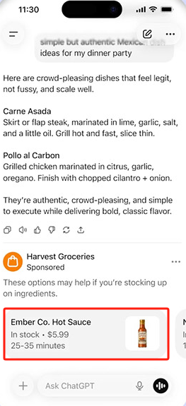 目前 ChatGPT 的广告会出现在免费版和今年初刚推出的低价订阅版 ChatGPT Go(月费约8美元)中。它会根据你的对话实时推送,比如你问“今晚吃什么”,ChatGPT 不光推荐菜谱,还可能直接在答案底下贴出调味料广告。图源:mdroid