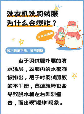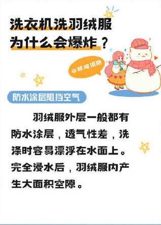 此外,很多羽绒服的外层面料都有防水、防风的涂层,干洗剂也会导致其脱落,让羽绒服失去防风防水功能。而洗衣机在甩干时会高速搅拌,一不留神就会发生极个别的爆炸情况。