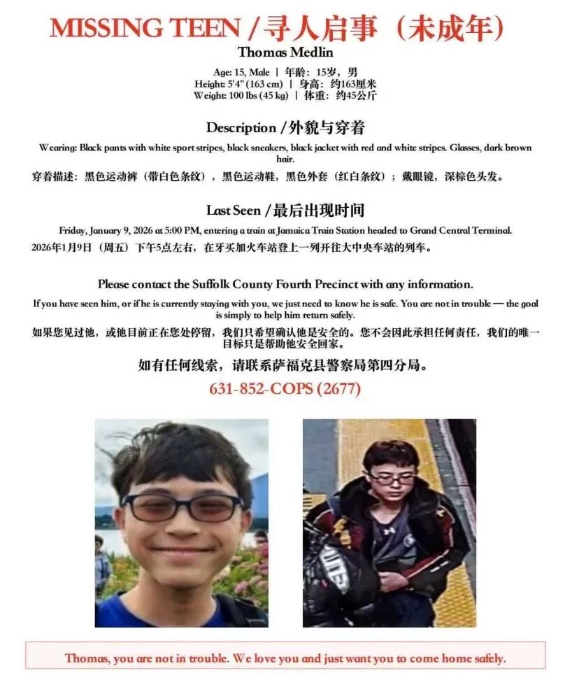 一名来自纽约长岛的15岁华裔男孩Thomas Medlin,在独自搭乘火车前往纽约市后已失联超过两周。警方、家属与志愿者仍在持续搜寻,而母亲此刻只有一个心愿——希望孩子能平安回家。 家人也恳请社会各界力量帮忙寻找孩子!