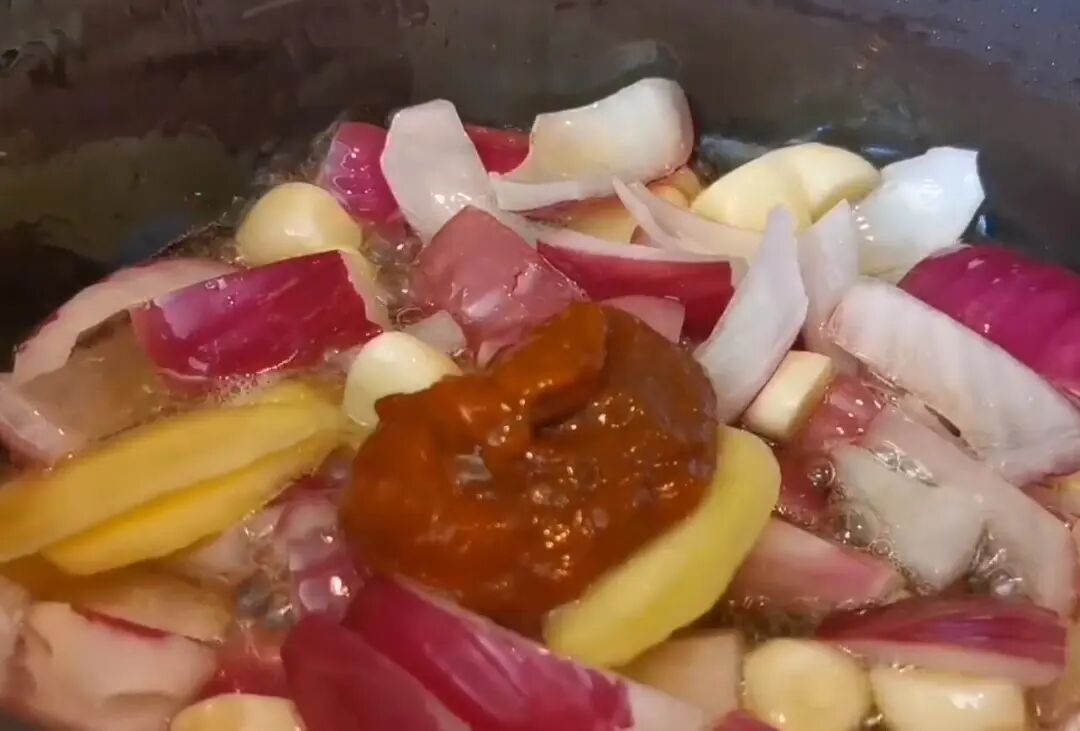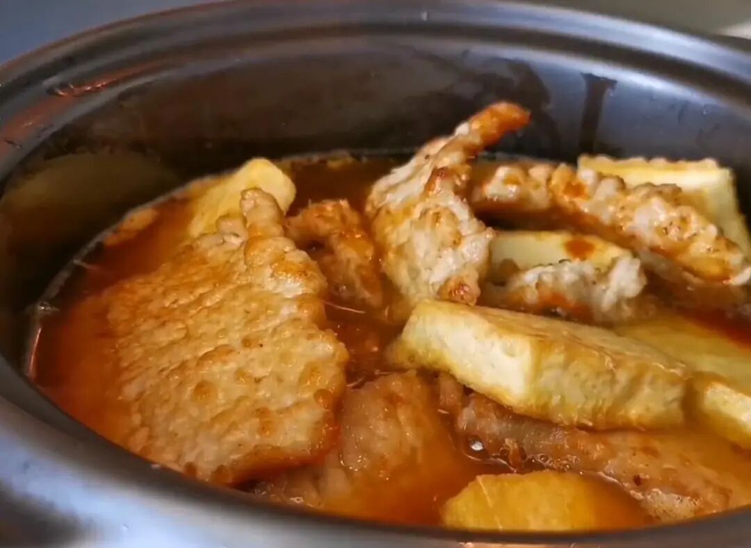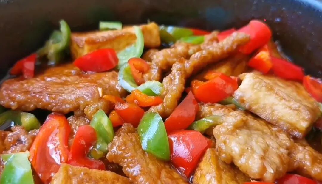 做法: 1,准备好食材:豆腐,五花肉,鸡蛋,洋葱,青红椒 2,瘦肉切成厚一点的薄片,用刀背在肉上面不断地敲打,翻面继续敲打 3,全部敲打好之后放入盘中备用这样的肉吃起来更加细嫩 4,碗中打入两个鸡蛋打散后一半浇到肉上,一半备用,再加入适量的食盐,胡椒粉,葱姜,抓拌均匀,腌制半个小时, 5,调一个料汁:两勺生抽,一勺老抽,两勺料酒,一勺蚝油,白胡椒粉,一勺白糖, 6,豆腐切成薄片装入碗中,倒入剩余一半的蛋液备用 7,起锅烧油下入豆腐片小火慢煎,煎至金黄翻面 8,豆片煎至两面金黄控油捞出备用 9,肉腌制好之后挑出葱姜 10,倒入一勺淀粉抓拌均匀,有一点粘手即可 11,起锅烧油下入腌制好的肉片,小火慢煎,煎至两面微黄控油盛出备用 12,砂锅里加入适量的食用油,下入葱姜洋葱,炒出香味加入一勺黄豆酱炒出香味 13,加入煎好的猪肉片和豆腐片,倒入调至好的料汁,倒入清水,大火烧开后转小火 14,时间到加入备好的青红椒煮两分钟即可关火出锅 15,非常好吃的一道美食就做好了