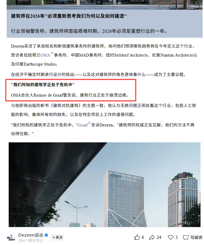 就在Benoy撤离香港的同时,荷兰知名建筑事务所 OMA 的合伙人 Reinier De Graaf 在 Dezeen 的访谈里警示,2026 年全球建筑行业正面临严峻危机。他认为,我们所知的建筑学正处于崩溃边缘,建筑师的权威在瓦解,传统的工作方法不再适用。AI 的介入正在改变设计流程,可持续发展的要求也在倒逼行业转型,经济的不确定性更是让项目落地变得艰难。