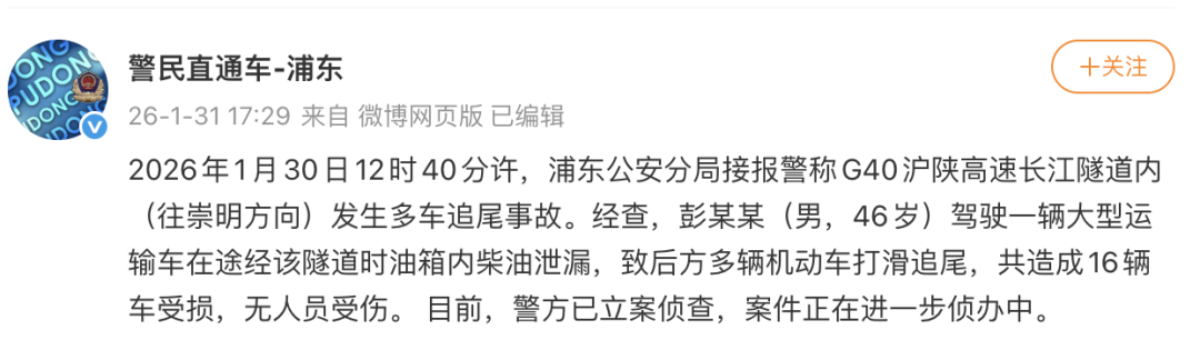 @警民直通车-浦东 1月31日消息,上海浦东公安分局接报警称G40沪陕高速长江隧道内(往崇明方向)发生多车追尾事故。经查,彭某某(男,46岁)驾驶一辆大型运输车在途经该隧道时油箱内柴油泄漏,致后方多辆机动车打滑追尾,共造成16辆车受损,无人员受伤。