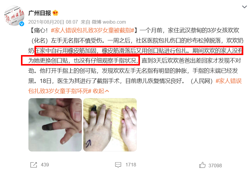 刘医生询问家长得知,一周前,因为小花的新鞋磨脚,他们便用创可贴对她的脚后跟进行包扎,已经好几天没换了。