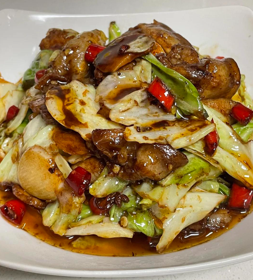 ️再起锅烧油。油热,将五花肉煸炒出油脂,放入花椒、蒜、小米辣炒香,然后再倒入调好的料汁炒香炒上色。放入包菜翻炒均匀即可出锅,喜欢的姐妹可以去试一试,这样做出来的包菜五花肉真的巨下饭。