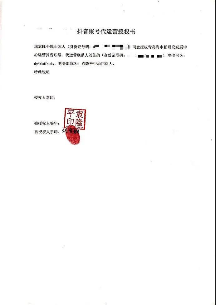 今日,有媒体报道称,袁隆平入驻抖音,“其本人并不知情”。现将袁隆平抖音官方账号“袁隆平中华拓荒人”入驻过程说明如下:1.2020年8月,青岛海水稻研究发展中心有限公司(以下简称:青岛海水稻中心,袁隆平院士为该公司法定代表人)与我们取得联系,就袁隆平院士入驻抖音、今日头条、西瓜视频,科普“三农”知识等方面合作进行多次沟通。2.2020年10月,青岛海水稻中心工作人员向抖音提供了袁隆平授权函和袁隆平本人身份证信息等认证必需资料,完成实名认证。3.认证后,原计划2021年1月12日,@袁隆平中华拓荒人 将在今日头条、抖音、西瓜视频平台发布首条视频,于1月15日第五届国际海水稻论坛上开启首场直播,并签约加入字节跳动公益“三农合伙人”项目。我们对袁隆平院士充满敬意,该账号的后续处理,将完全尊重院士及其相关工作团队的意见。特此说明。