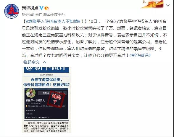 据@新华视点 1月11日消息,10日,一个名为“袁隆平中华拓荒人”的抖音号迅速引发粉丝追捧,数小时粉丝量就突破了千万。 然而,经记者核实,袁老目前正在海南三亚南繁基地科研攻关;对于该抖音号,袁老表示自己并不知情,不过他对网友的热情表示感谢。记者了解到,注册这个抖音号的是某公司。袁老忙于实验,你却去蹭热点,拿人们对袁老的崇敬、对科学精神的崇尚去吸粉、引流,合适吗?袁老时间何其宝贵,让他分心分神更不合适!