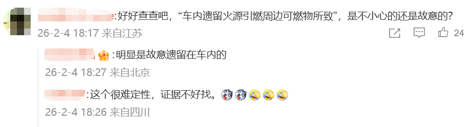 2月4日,据@小米公司发言人 :2月1日,辽宁省营口市一台小米SU7车辆的主驾驶座椅处冒烟并起火,经消防救援部门到场处置后迅速扑灭,现场无人员受伤。经向车主了解今日已收到认定书,该起事故系车内遗留火源引燃周边可燃物所致,非车辆自身原因产生。 网传视频中所谓的“烟花”情况,系车辆安全气囊因燃烧引爆导致,与电池等无关。我们将协助客户妥善处理后续事宜。 请广大网友不信谣、不传谣。 对于小米公司发言人此次辟谣,部分网友纷纷表示,“要调查是故意还是意外”“希望能查清楚是不是恶意的行为”。 近期,有网友发布视频称,辽宁营口一辆小米SU7充电后起火,现场浓烟滚滚,并伴有爆炸火花。相关视频流传颇广,引发市场关注。 据悉,该车辆为租赁车辆,事故发生前,车辆刚刚完成充电,驶出充电车位不久。车辆起火燃烧,消防人员及时赶到并进行了专业处置,事故中并无人员伤亡。几分钟后车辆才开始出现明火,整个驾驶舱被大火吞没,并伴随有疑似安全气囊爆燃物引发的火花爆炸。 近期,小米公司发言人曾多次就相关火情事件进行通报。 1月20日,小米公司发言人通报1月19日海南海口一汽车维修店出现火情的情况。小米称,截至车辆离线数据中断前,动力电池均处于正常状态。随后现场火情已由消防部门及时扑灭,没有造成人员受伤。 同期,河南开封S83兰南高速上,一辆小米YU7发生意外交通事故。小米称,发生事故后,车辆前部受损,驾驶员正常停靠应急车道,车内驾乘人员及时撤离,无人员伤亡。截至16点14分车辆离线前,动力电池与小电池状态均处于正常范围内。后车辆发生起火出现明火,现场火情已由消防部门及时扑灭。 此外,2025年11月,小米公司发言人还曾就“小米汽车工厂内电池产线起火”谣言发表澄清声明。2024年,小米汽车工厂电池车间的生产设备,在调试优化过程中,操作人员在手动模式下调试操作失误,使AGV上托运的电池包与设备发生磕碰,电芯被划伤,从而造成该电池包短路引起明火,火情极小。车间迅速启动处理预案,相关火情被迅速扑灭,未波及其他生产区域,且没有造成人员受伤。 小米称,该起事件为生产流程调试工作中出现的偏差,并不是电池本身存在设计缺陷、材料问题或制造瑕疵。小米汽车所有车型电池包均坚持超高标准开发,小米SU7、小米YU7电池均满足电池国标相关要求,请广大车主放心。 2月1日,小米汽车公布了2026年1月的交付数据——交付量超3.9万辆。对于外界将小米汽车1月交付量与2025年12月对比称环比数据下滑,雷军在2月1日的直播中直呼“这种对比太不客观了”。 “1月是车市淡季,一般交付量都会比(去年)12月份低。另外,第一代小米SU7已经停售,只有零星的现车、展车在销售。1月份,我们主要交付的新车以YU7为主。”雷军强调称,2026年1月份能交付这个量(3.9万辆),已经很了不起了。 目前,小米汽车在售车型仅有小米SU7和YU7两款。“截至目前,小米汽车累计交付量有小60万辆。”在直播的最后,雷军针对近期外界关注的“关于小米汽车二手车崩盘”一事进行了回应。雷军指出,在近期中国汽车流通协会联合精真估发布的《2025年度中国汽车保值率报告》中,小米SU7在纯电动保值率排名中位列第一,一年保值率达86%,是保值率最强的电动汽车。 “有时候个别车商为了蹭流量,在那里又哭又闹的,见到这样的视频,欢迎大家帮我们举报一下。”雷军强调,事实上,小米汽车近几年的产品年度保值率表现都很出色。