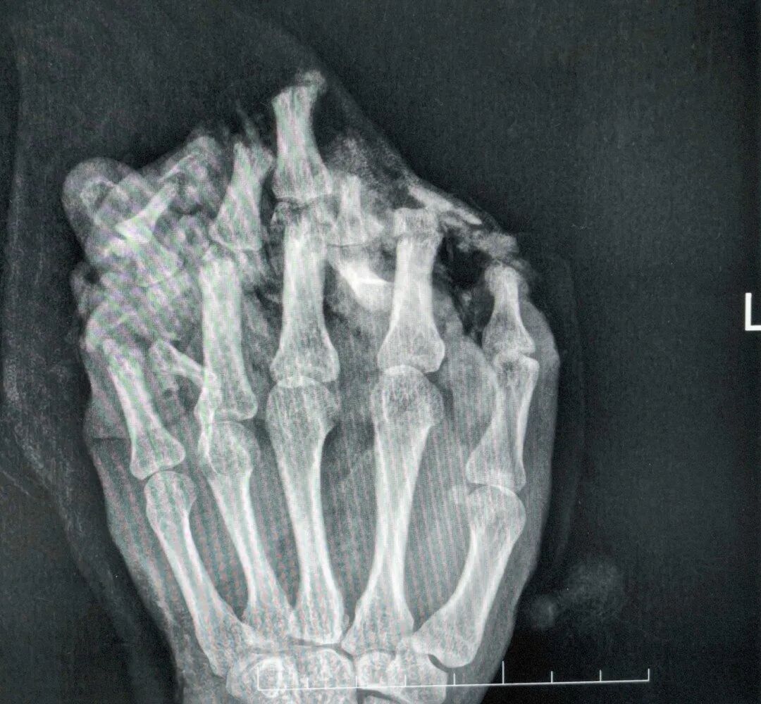 医院随即为小王做了手术,术中,医生们完成了彻底的清创,修复了骨折、断裂的肌腱与神经。