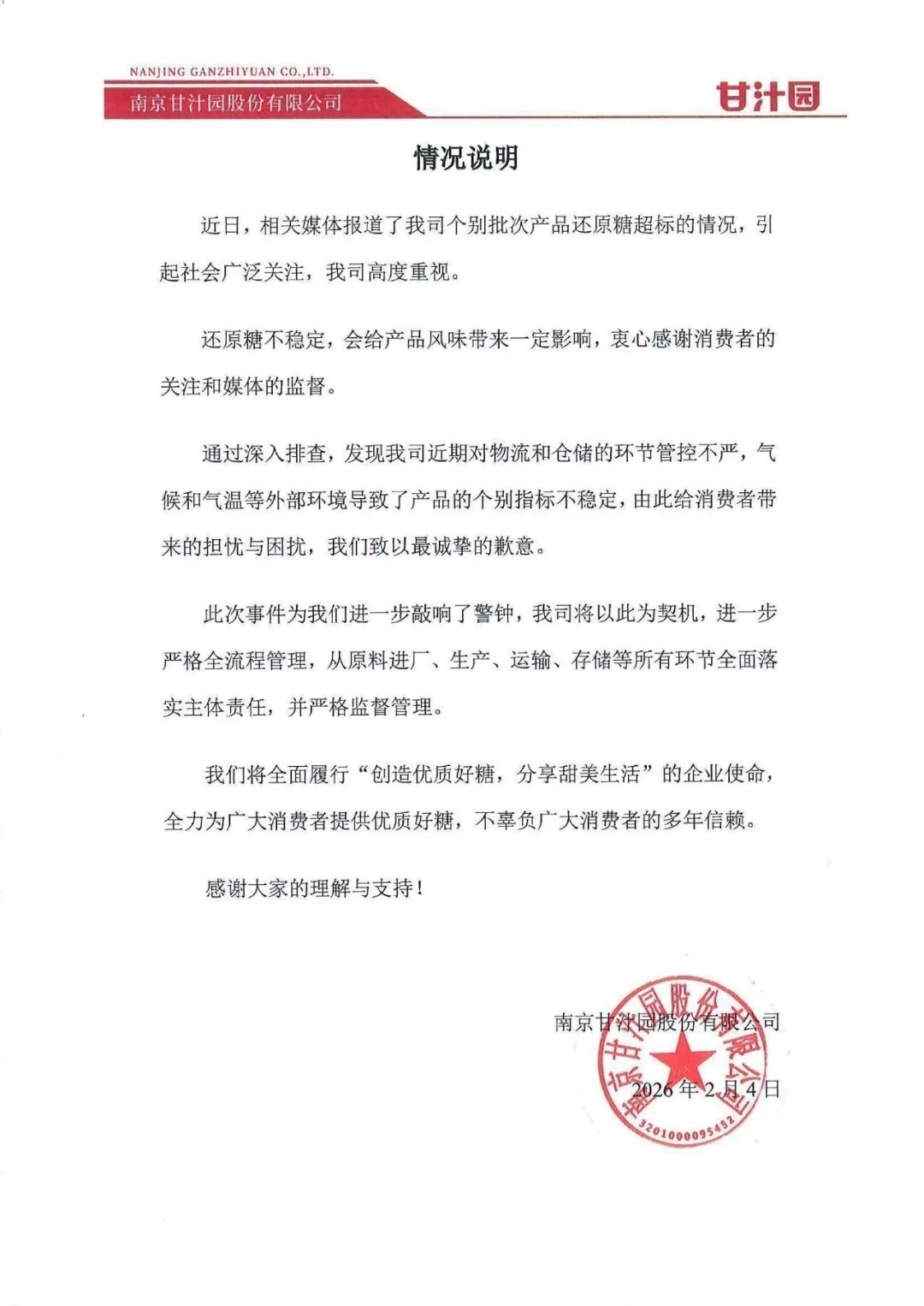 2月5日,南京甘汁园就生产销售不合格糖制品一事发布情况说明:南京甘汁园生产销售不合格糖制品被处罚