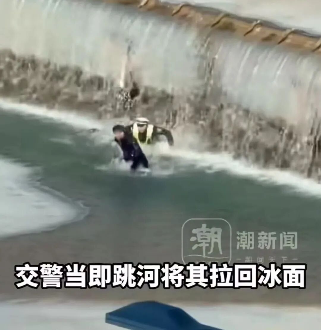 坐于堤坝边沿,交警赶来试图将其拉起时不慎滑倒,男子随即坠落水中,交警也赶忙跳下,将男子拉至冰面上