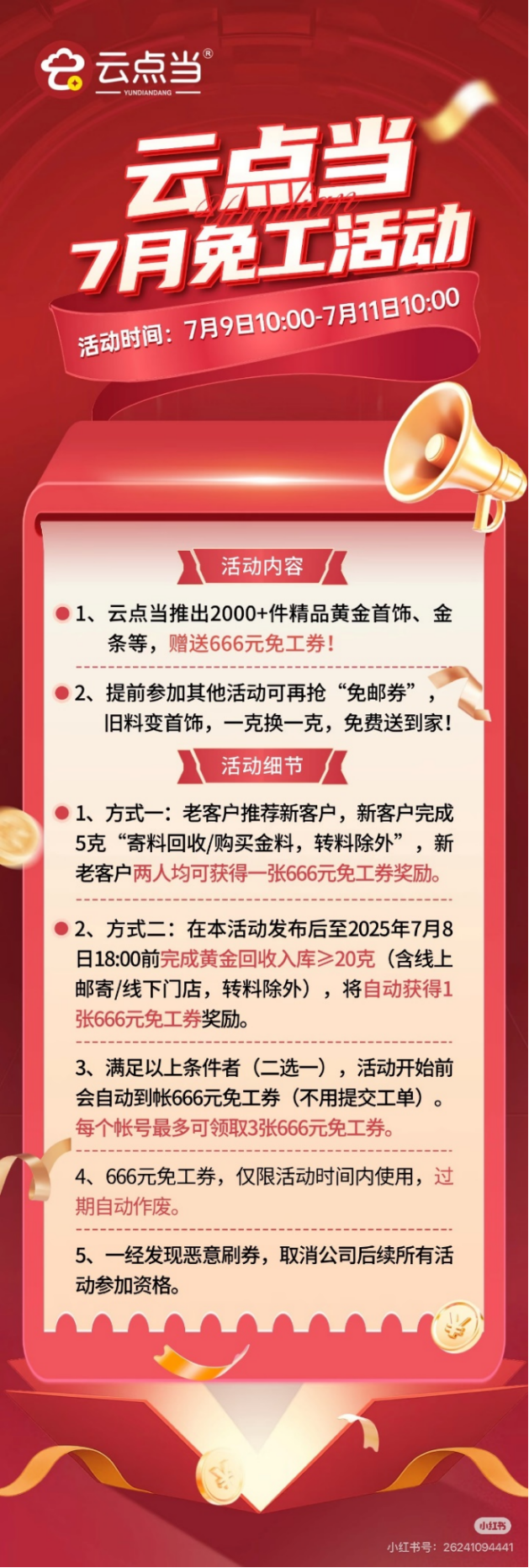 更具吸引力的是,云点当还会不定期推出免工费活动,每次都会上架2000多件精品黄金首饰和金条,发放过666元的免工券,进一步降低用户的购买成本。