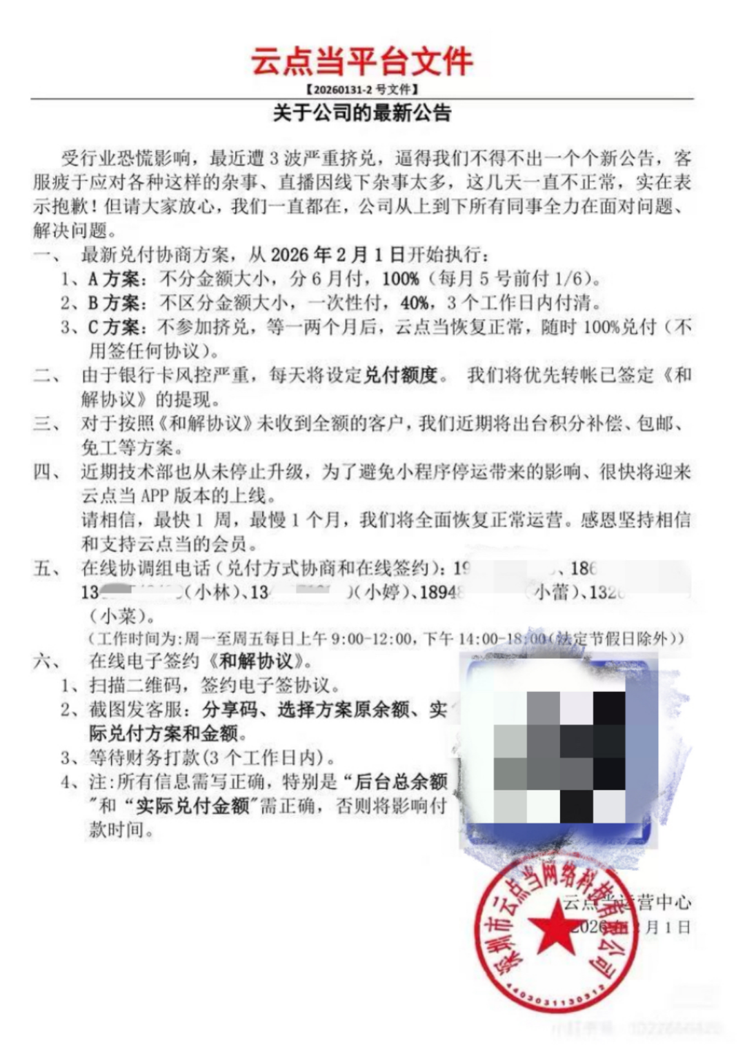 凤凰网《风暴眼》拿到一份盖了云点当运营中心公章、日期是2026年2月1日的官方公告,其中直言,本轮危机的直接导火索,是行业整体恐慌情绪外溢引发的集中提现浪潮。