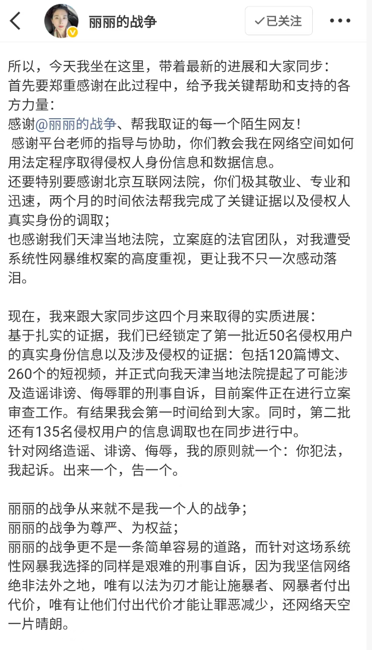 基于扎实的证据,我们已经锁定了第一批近50名侵权用户的真实身份信息以及涉及侵权的证据,包括120篇博文、260个的短视频,并正式向我天津当地法院提起了可能涉及造谣诽谤、侮辱罪的刑事自诉,目前案件正在进行立案审查工作。
