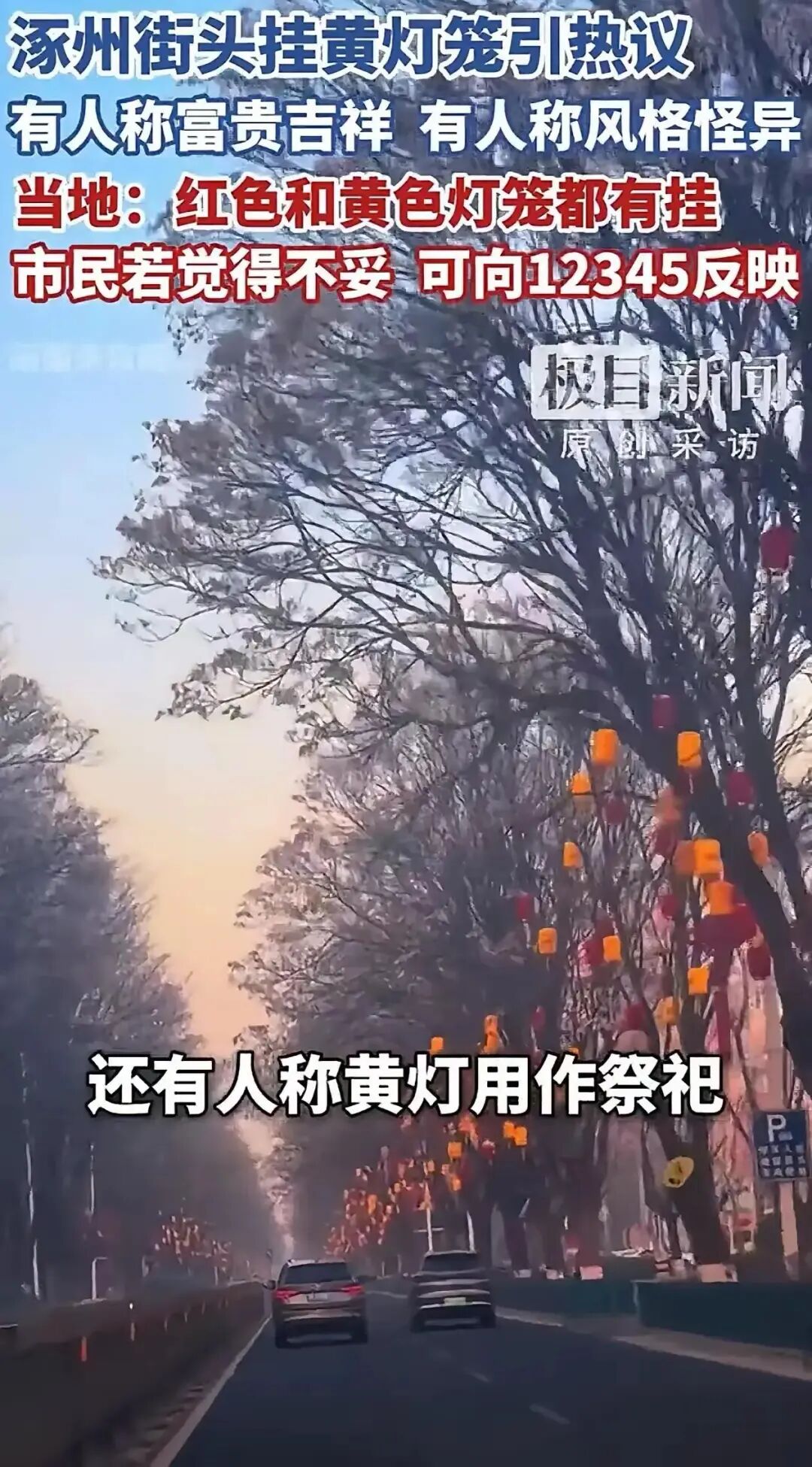 临近春节,各地街头都开始挂上灯笼。众所周知,过年我们都是以红色为主,有喜庆的寓意,正所谓红红火火嘛。但是有人发现,河北涿州的大街上,竟然挂上了黄色的灯笼。这抹鲜亮的颜色在冬日的街头格外显眼,很快就在网络上点燃了公众对传统色彩的讨论,并引起很大的争议。