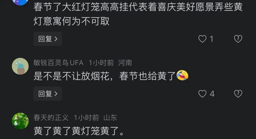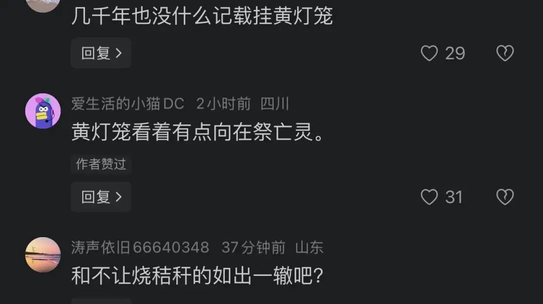 要知道,灯笼作为我们传统节庆的重要装饰,其色彩选择往往承载着丰富的文化内涵和集体情感。而像过年这样的节日,几乎都要挂上红色的灯笼。视频发布之后,网友纷纷展开热议。一部分网友觉得“有点怪异”,甚至有人将黄色灯笼与传统祭祀活动联系起来。