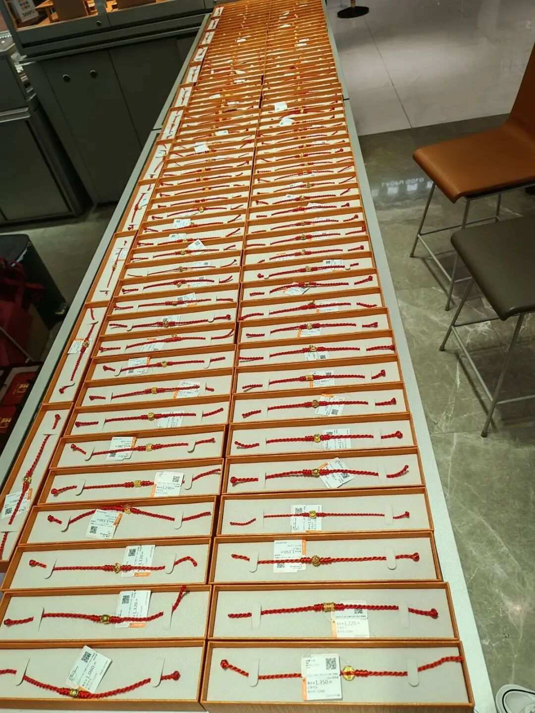 刘店长告诉记者,这238件黄金饰品主要为黄金手链,在红绳上编进黄金首饰,春节将至,寓意好又十分应景。其中,有的是顾客选购的品牌成品手链,有的则由顾客选定黄金吊坠,再由柜台工作人员手工编织而成。