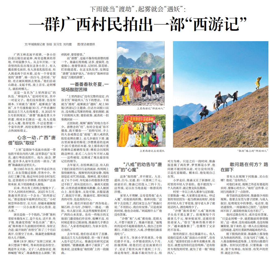这是一支名为“上里西游记”的队伍,“师徒四人”是同村村民,其中一对是父子。他们没有搭景,也没有剧本,下雨就当“渡劫”,起雾就会“遇妖”,8个月涨粉超30万,户外直播时最高达5万人在线观看。从2025年5月拍到现在,“唐僧”陈淼花费大半积蓄,将同乡们聚在一起,有人说他走火入魔,他却觉得,不过是想圆一个童年的梦,再给安静的乡村增添一点热闹和情义。