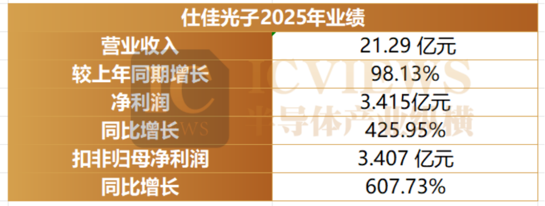 业绩预告显示,仕佳光子 2025 年预计实现营业收入约 21.29 亿元,同比增幅达 98.13%;归属于上市公司股东的净利润 3.415 亿元,同比飙升 425.95%;扣非归母净利润 3.407 亿元,增幅高达 607.73%。据公告披露,上年同期公司营收为 10.7453 亿元,归母净利润 6493 万元,扣非归母净利润 4814 万元,2025 年各项核心财务指标均实现翻倍式增长(业绩数据为公司财务部门初步测算结果)。