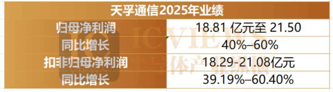 天孚通信披露的业绩预告显示,全年归母净利润预计为 18.81 亿元至 21.50 亿元,同比增幅 40%–60%;扣非归母净利润预计 18.29 亿元至 21.08 亿元,同比增长 39.19%–60.40%,业绩表现符合行业高景气度趋势。