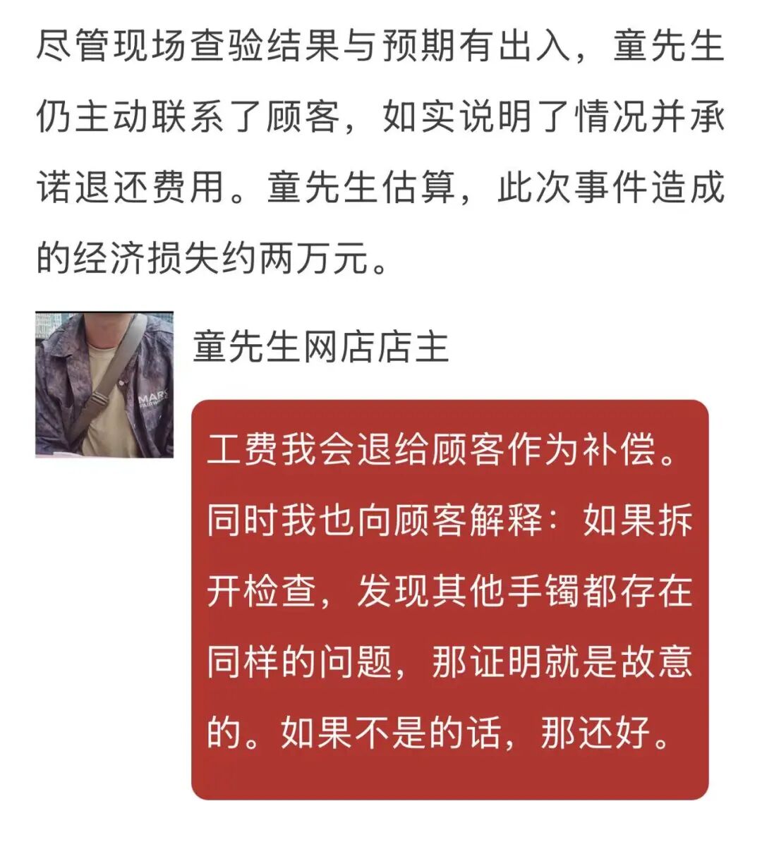 童先生表示,得知这一情况后,他第一时间联系到委托加工的公司,对方否认了往手镯里塞钢珠的行为。为维护店铺信誉,童先生立即启动召回程序,召回了该批次已售出的9个手镯中的5个。