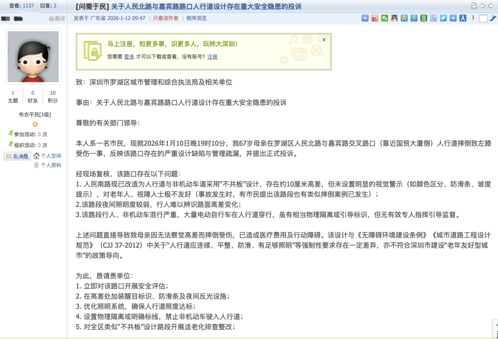 近日,记者关注到有市民在深圳论坛发帖,反映人民南路与嘉宾路交会路口旁的人行道存在安全隐患。据其描述,其母亲于1月某晚在该路口靠近国际贸易中心大厦一侧的人行道不慎摔倒,此事已产生医疗费用并造成行动不便。