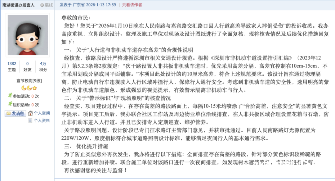 记者注意到,南湖街道办于1月13日在深圳论坛公开回应称,经核查,该路段设计严格遵循深圳市相关交通设计规范,路灯照度指标符合城市道路照明设计标准。为防止类似意外再次发生,街道办表示将全面排查存在高差的路段,对标识稀疏路段进行重新增加补喷,并联合施工单位对该路口进行夜间排查,对遮挡路灯的树木进行修剪。