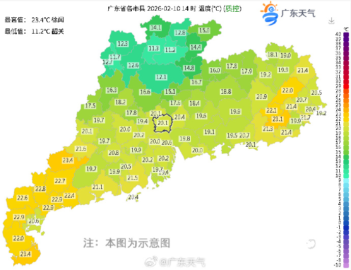 昨天(2月10日)早晨,东北地区东部升温十分明显,不少地方与前一天同时次相比大幅上升了10-20℃,像吉林通化县升幅达22.3℃。14时,广东气温介于11.2~23.4℃之间,从24小时变温图看到,各地都有升温,普宁回升最明显,达7.3℃。