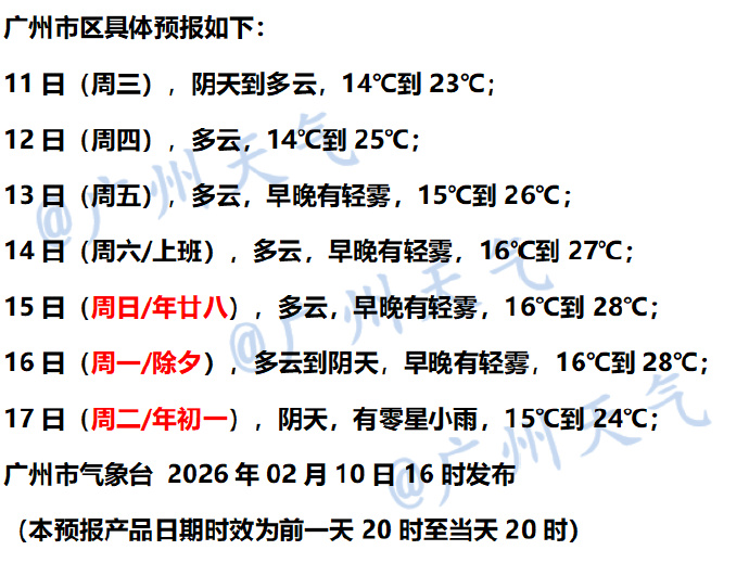 11日(周三),阴天到多云,14℃到23℃; 12日(周四),多云,14℃到25℃; 13日(周五),多云,早晚有轻雾,15℃到26℃。