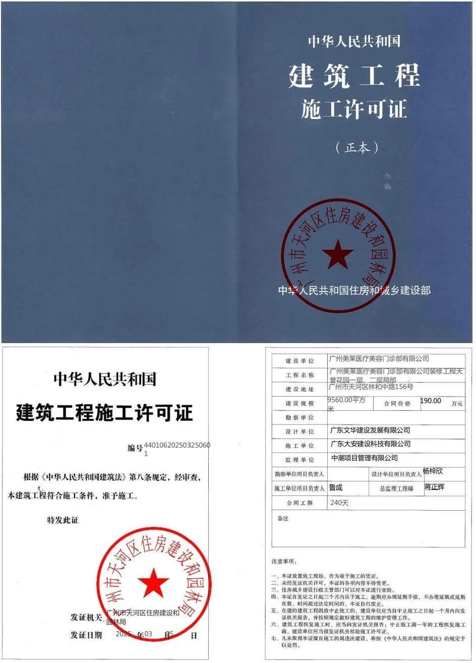 针对居民对于工程“未批先建”的质疑,广州美莱称,在工程启动前,院方已取得了天河区住房建设与园林局的施工许可,履行了合法的程序,不存在“未批先建”的违规情况。但值得一提的是,广州美莱提供的建筑工程施工许可证中的发证日期为2025年3月5日,而小区居民向“记者帮”提供的照片及业主群聊天截图显示,2025年2月项目已开始动工。