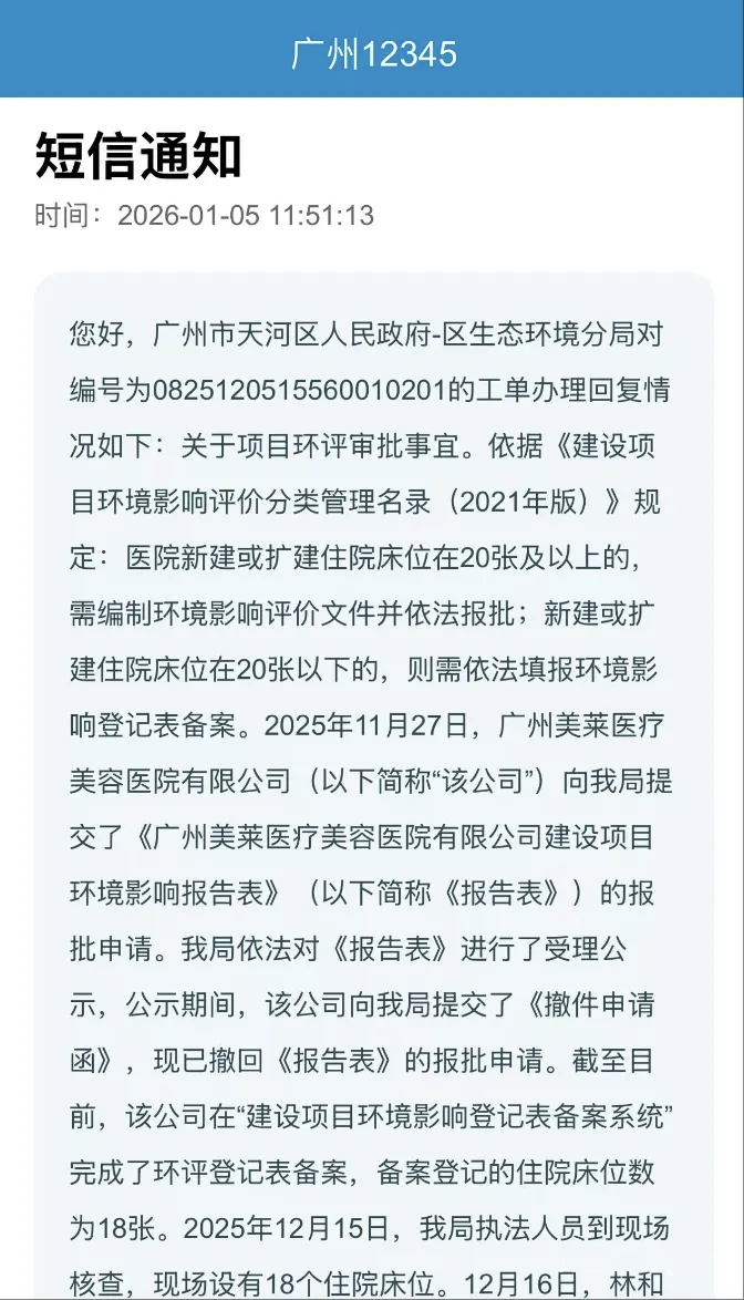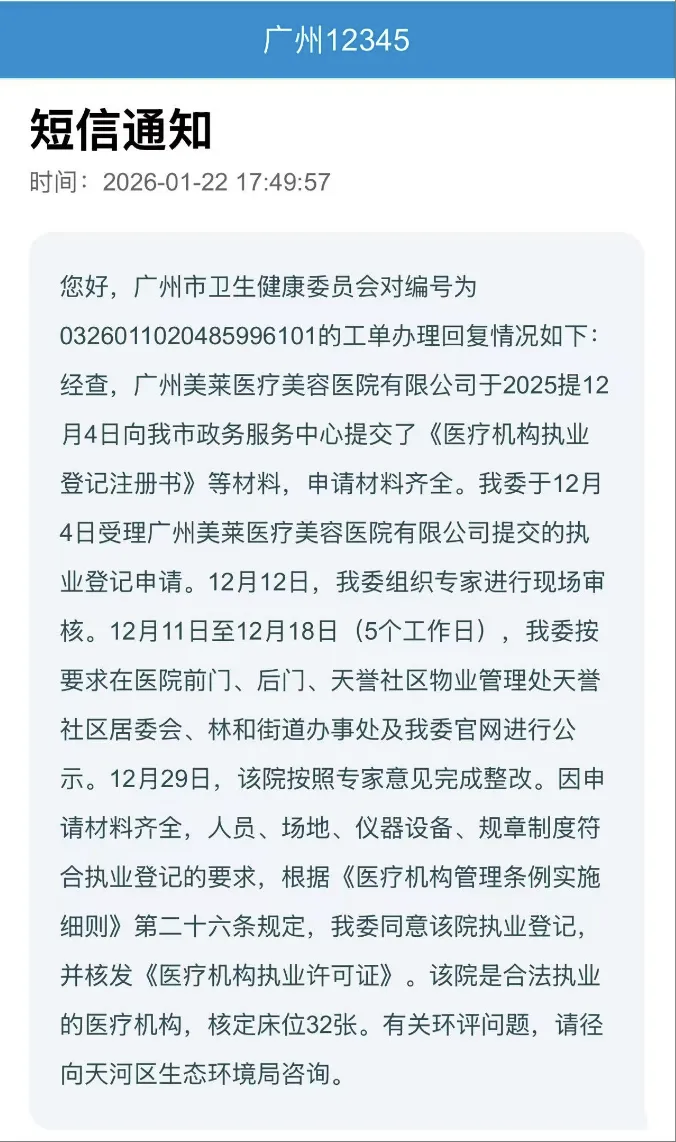 陈先生还对医院的床位数量产生质疑。他向记者提供了12345热线的回复截图,显示2025年12月12日广州市卫健委现场审核,核定床位数有32张;12月15日天河区生态环境分局现场核查,则是18个住院床位。陈先生称,他怀疑医院变动床位数是为了绕过有关部门的审查。
